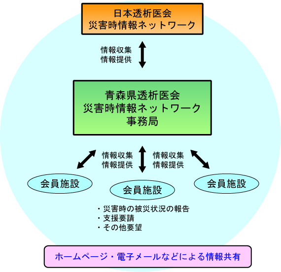 当事務局では、日本透析医会災害時情報ネットワーク等からの災害情報を各会員施設に電子メールで一斉送信することにより情報を共有します。